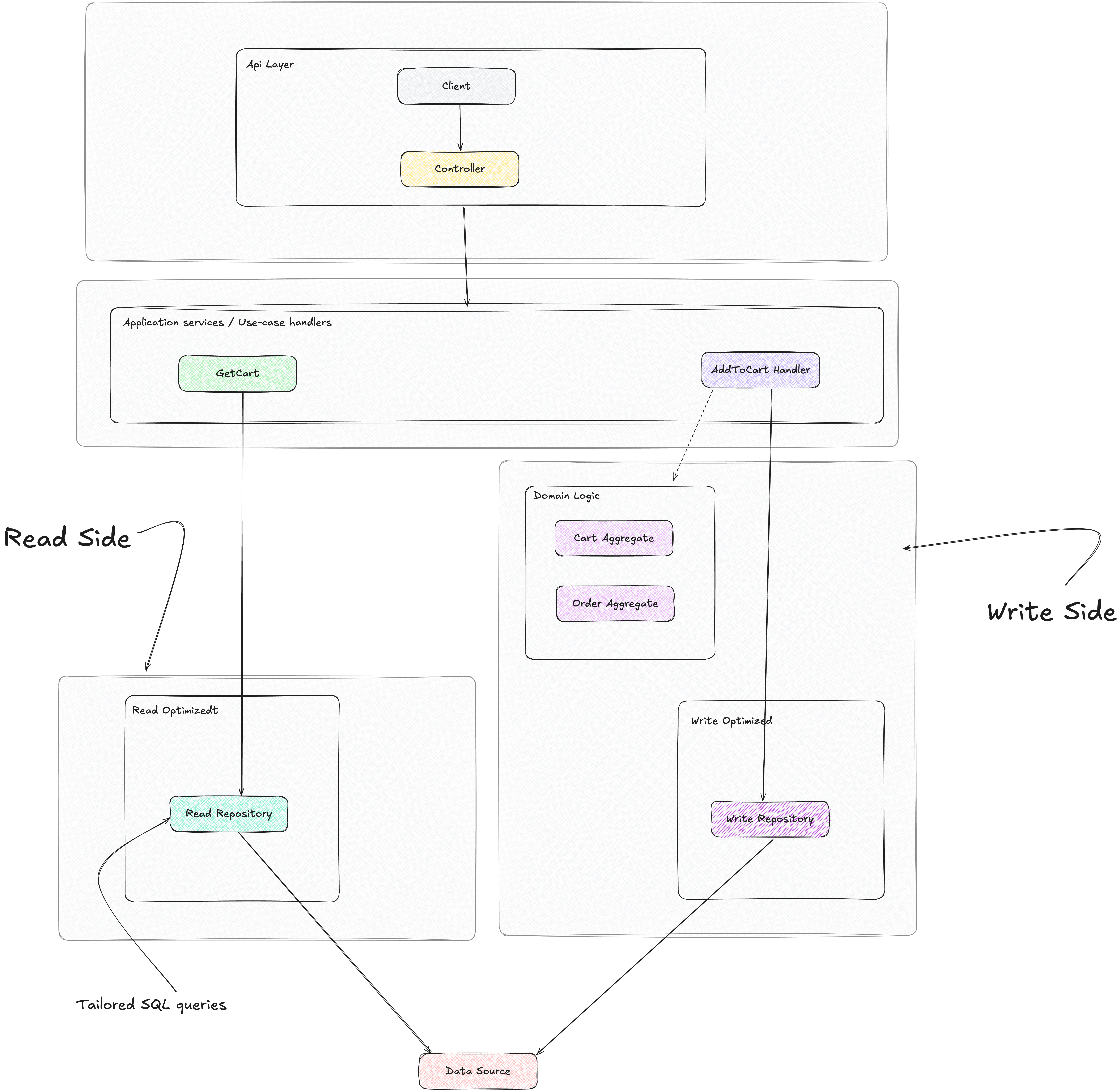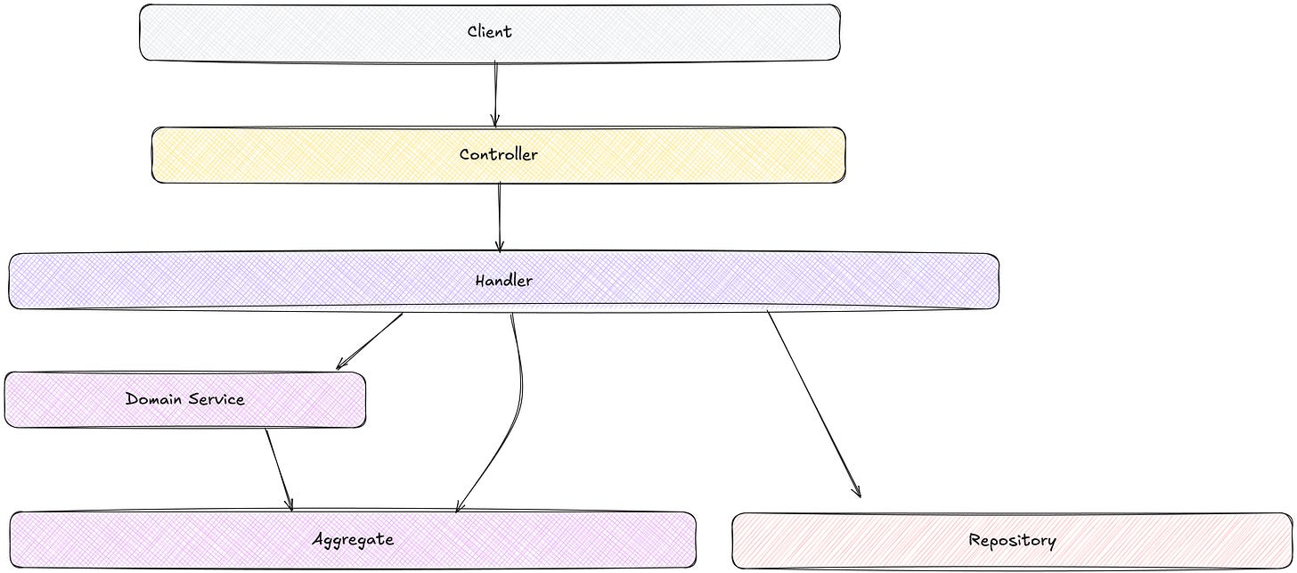Controllers depend on command and query handlers, which in turn depend on repositories and domain services defined by the domain layer. The domain layer itself has no outward dependencies—it defines interfaces that the infrastructure layer implements.