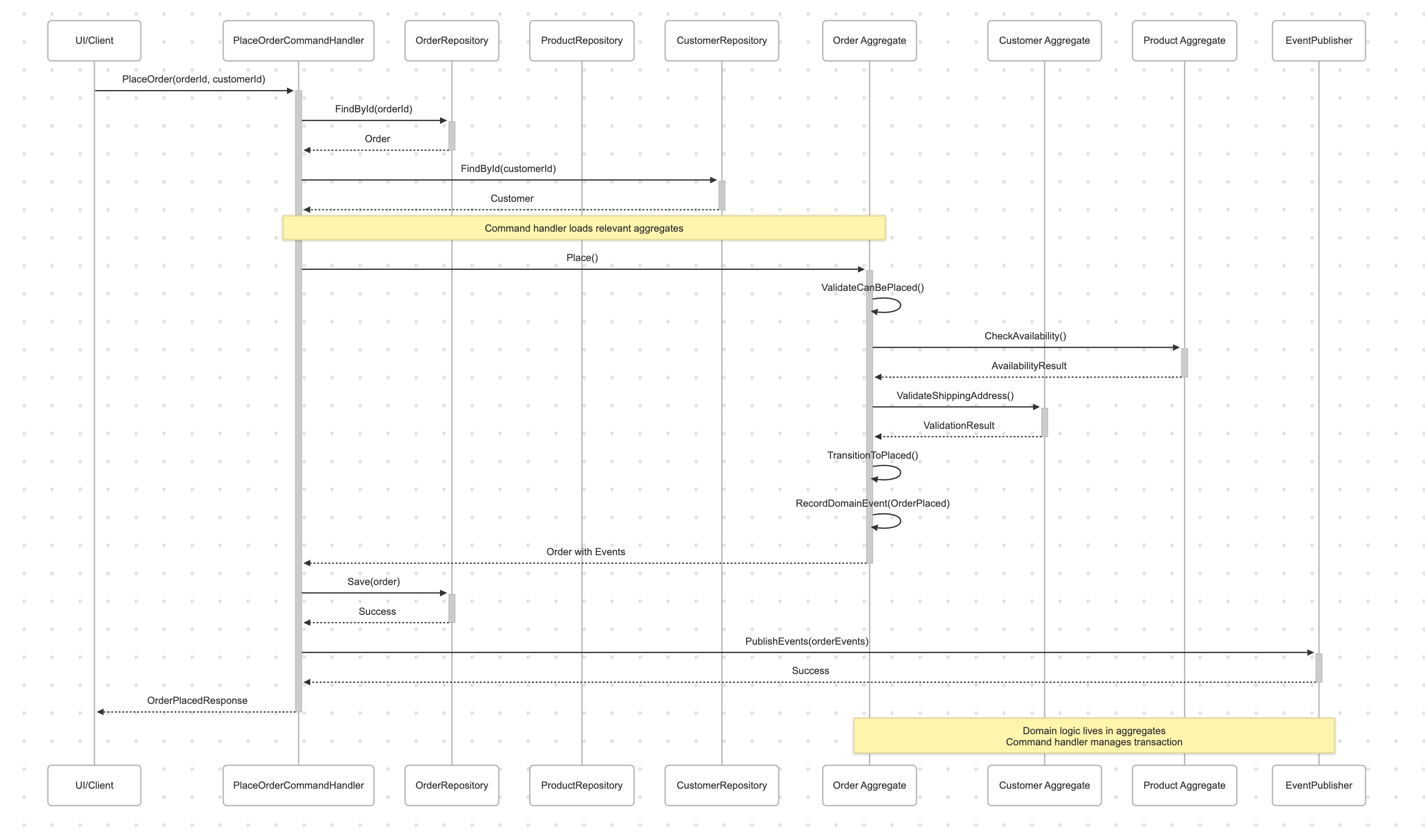 When a customer places an order, the PlaceOrderCommandHandler loads the relevant aggregates (Order, Customer, perhaps Product for inventory checks), then calls domain methods on these aggregates to execute the business operation. The aggregates themselves contain the business logic for validation, state transitions, and calculations.