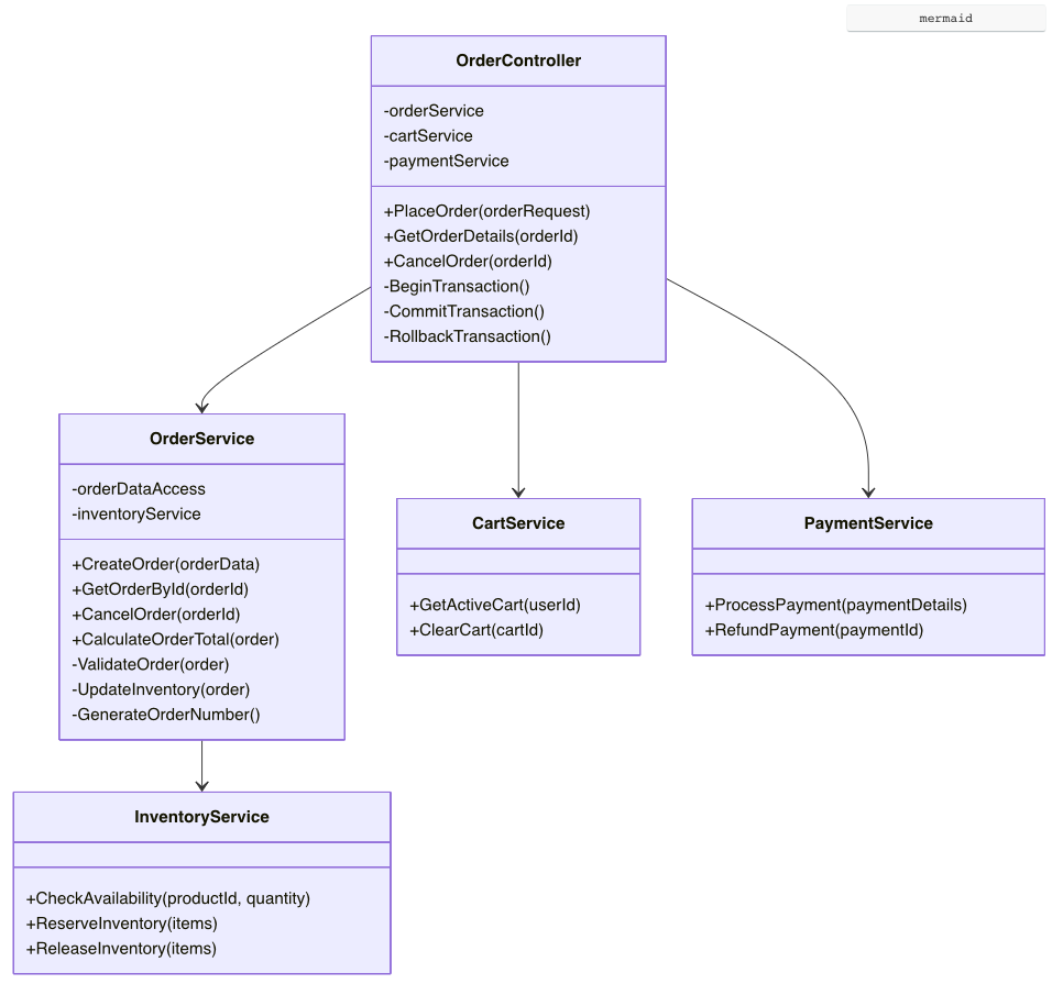 Complex operations can now be composed from simpler service calls. Creating an order involves multiple business operations, each handled by a specialized service. The OrderController orchestrates these calls but delegates the actual business operations to appropriate services.