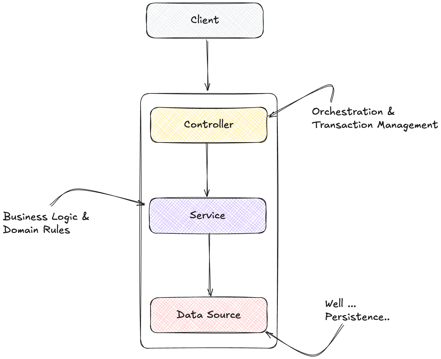 The controller layer takes responsibility for orchestration, workflow management, and transaction control. Controllers decide the sequence of operations, manage transaction boundaries, and coordinate the overall process, but delegate the actual business operations to services.